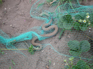 Ontem, dia de calor intenso, ao final da tarde fui colher morangos no limite sul do quintal. Ouvi soprar e logo vi, a cerca de um metro, uma cobra assustada enrolada na rede. Quanto mais tentava desembaraçá-la mais ela se enrolava vigorosamente na rede. Conseguia erguer a cabeça voltando-a para mim e com a secção ainda livre lançava-a na minha direcção a ver se me assustava e a deixava em paz.