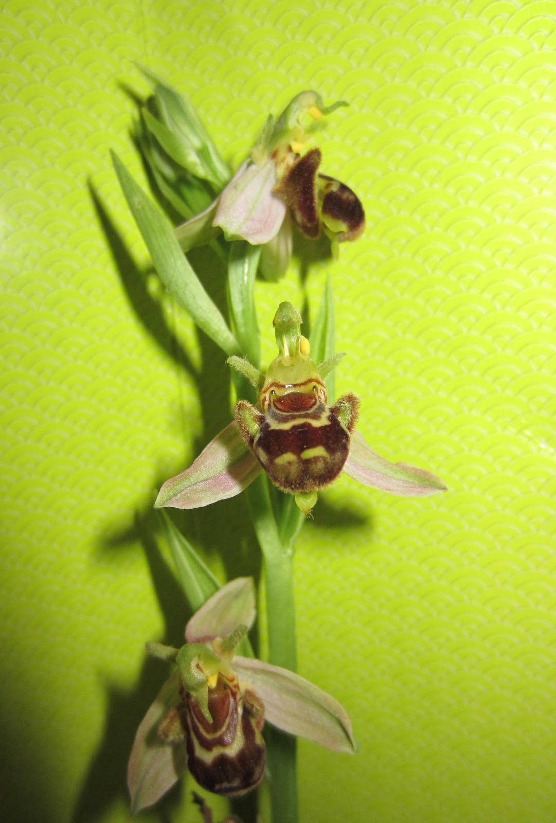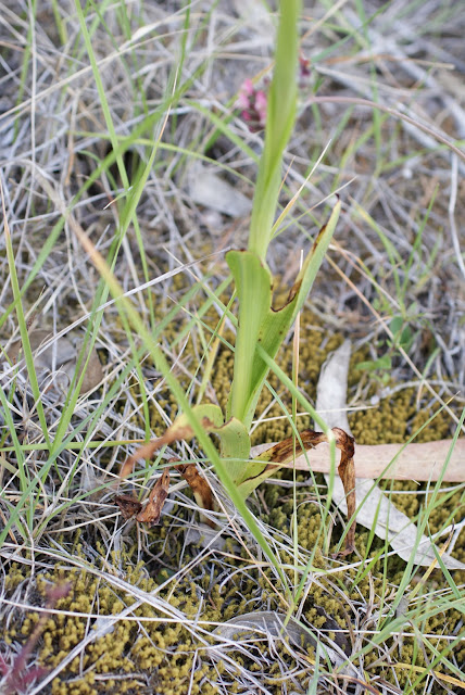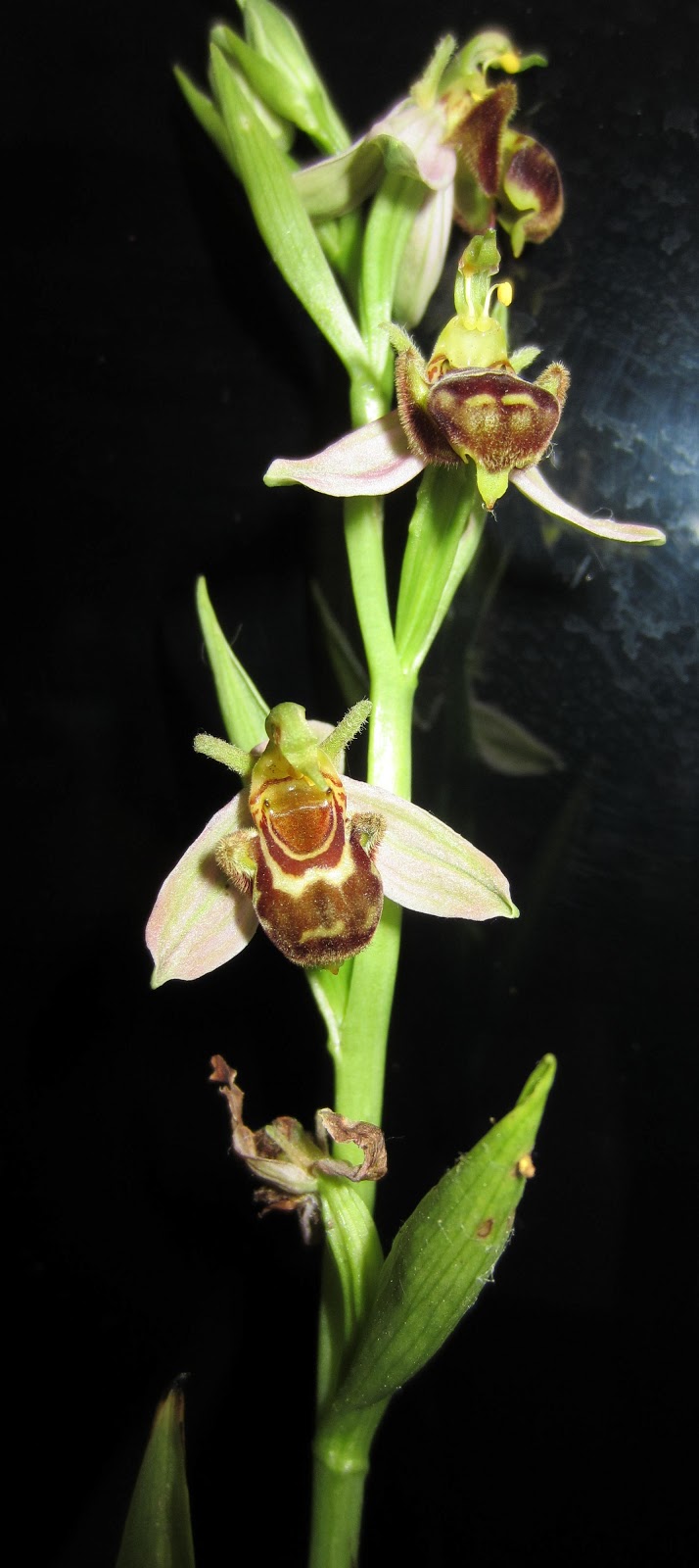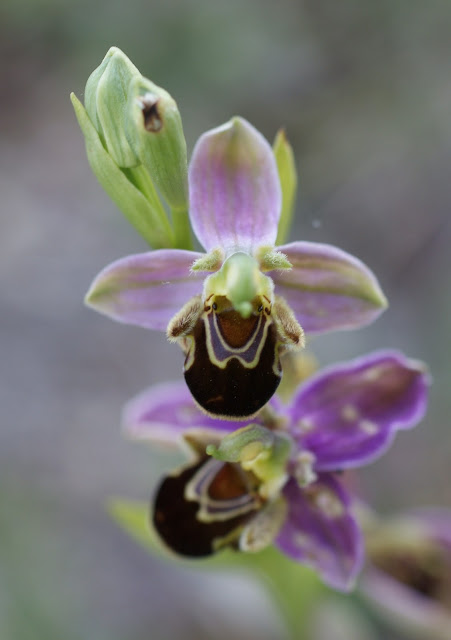 E, no entanto é sobretudo para o chão em volta que insistimos em olhar. Já tínhamos observado as vistosas anacamptis. Agora percorremos palmo a palmo as bermas intactas do caminho que segue na direcção sul em patamar talhado na encosta. Por entre um mar de herbáceas onde abundam os cardos (do outro lado da estrada é o sítio da Cardosa) encontramos finalmente as sofisticadas mas discretas ophrys. Anotamos as variações. Fotografamos.