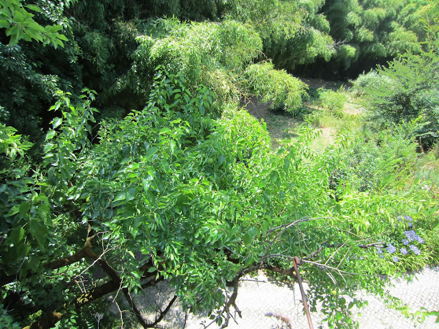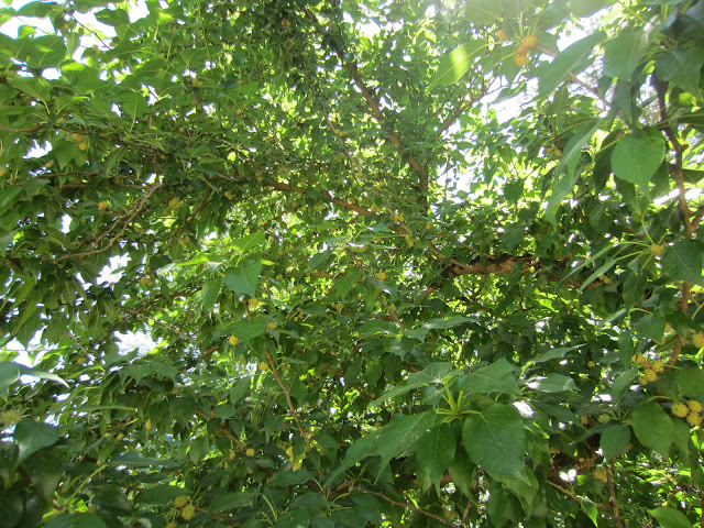 Em fins de Julho, início de tarde muito quente no Jardim Botânico de Coimbra, uma árvore junto ao miradouro desperta-nos a atenção pelos frutos globosos e pelo verde-brilhante da folhagem semelhante à das amoreiras. O tronco nasce num plano inferior e a copa fica ao alcance da mão.