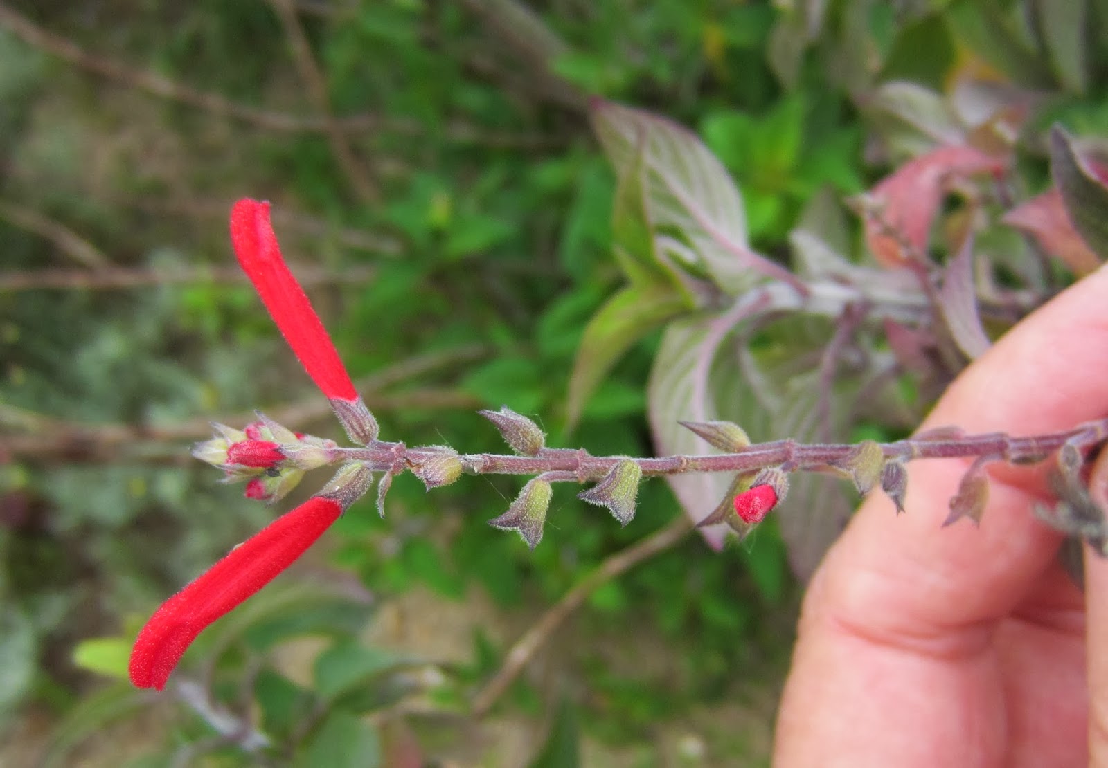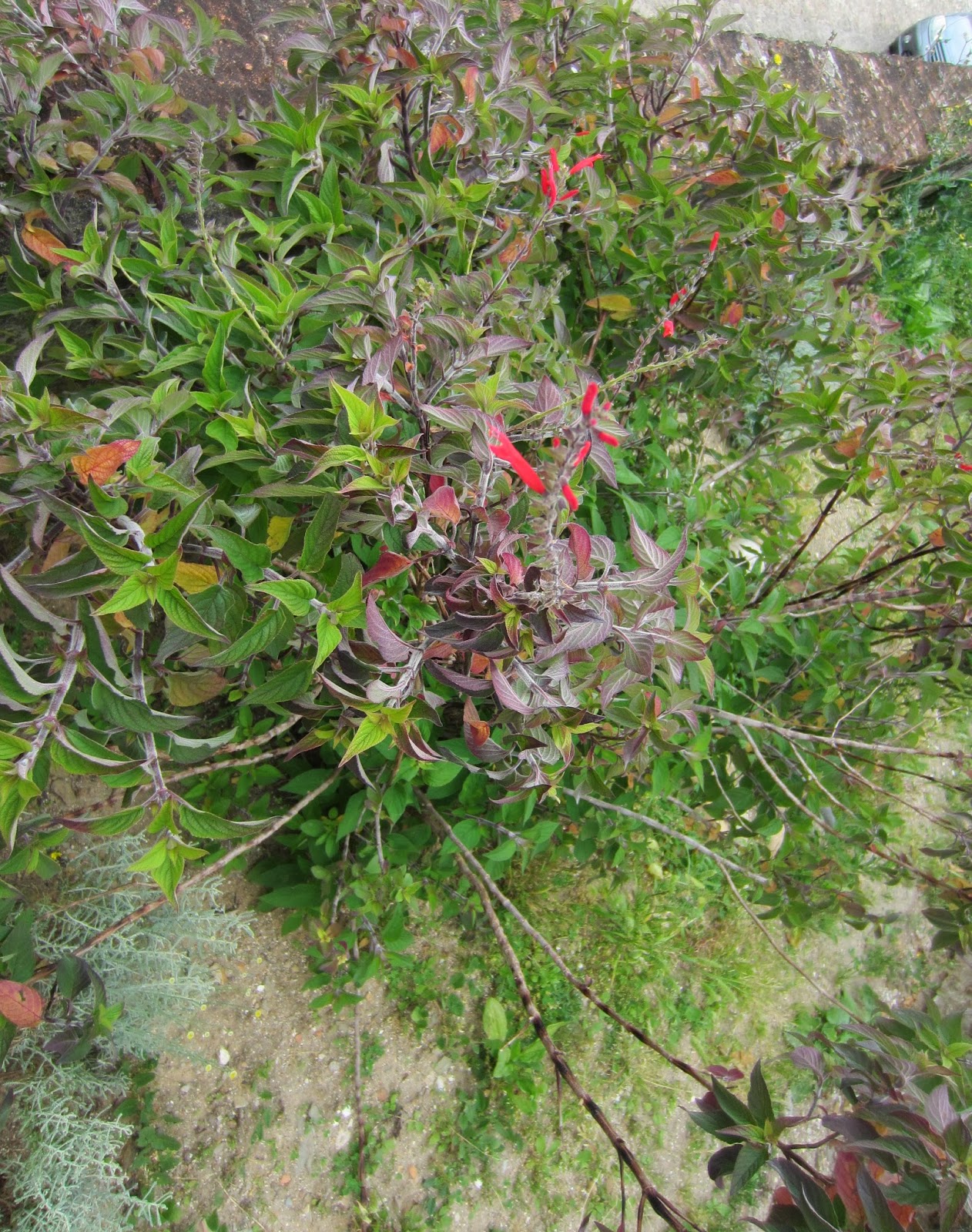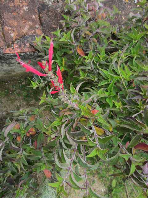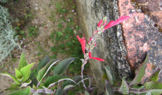 De entre elas destacava-se ainda que não cuidado, um subarbusto  com cerca de 1,20 m encostado ao murete de sustentação das terras, com algumas flores tubulares em vermelho, afinal inflorescências cimeiras em verticilastros de várias flores.  Mais de perto apercebemos a forma tubular e longa das corolas que se abrem entre dois lábios, um superior e outro inferior. Delas emergem os vistosos estiletes.