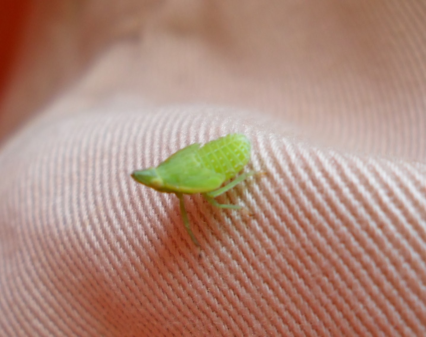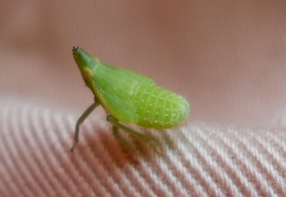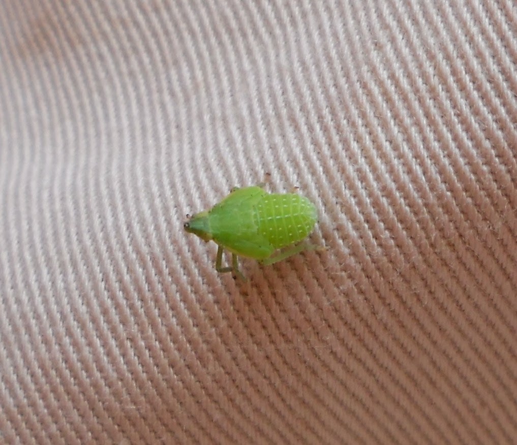 Não disponho de tempo para muito mais. Irei colocá-lo sobre um saco e os meus joelhos servirão de mesa. Cabeça de forma cónica com o vértice voltado para a frente e na base a mancha em tom amarelo claro dos olhos. Tórax, abdómen e três pares de patas sendo as posteriores um tanto mais compridas que as demais e por certo adaptadas à deslocação por saltos. Dois pares de asas semelhantes, curtas e transparentes, ainda pouco funcionais. Um belo insecto em verde claro com traços curtos alinhados paralelamente ao longo do dorso. Um juvenil com cerca de 9 mm de comprimento