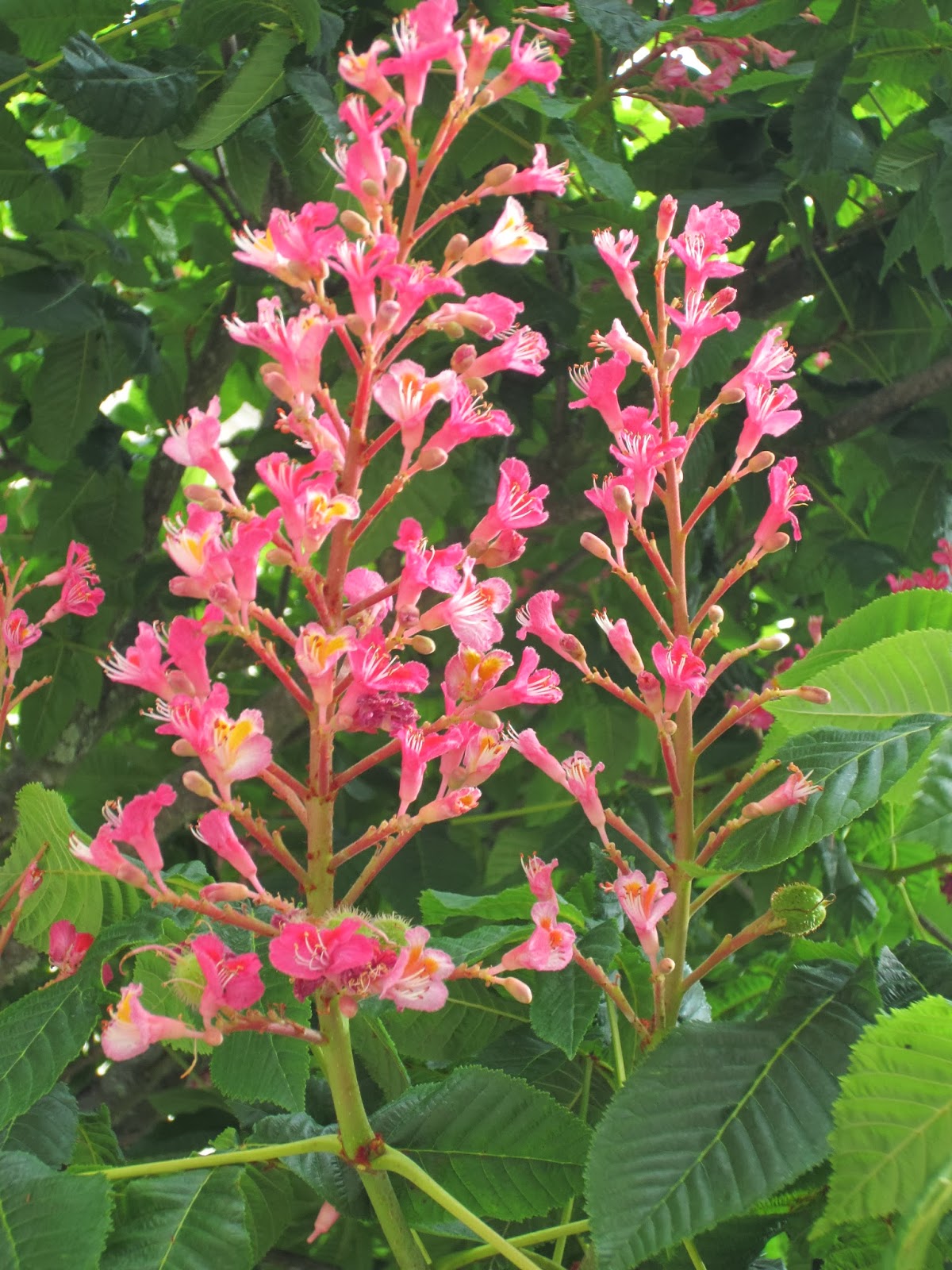 Diferentemente, o castanheiro das fotos, ainda um "falso castanheiro" mas com manifesto valor decorativo, é um híbrido de floração entre Abril e Junho. As flores de cinco pétalas fundidas em tubo, agrupam-se em cacho composto (panículas), mais largo na base. O contraste do verde da folhagem com o rosa-vivo das inflorescências dá-lhe um toque exótico que quebra a monotonia do contínuo do casario sugerindo evasão. Uma lufada de frescura!