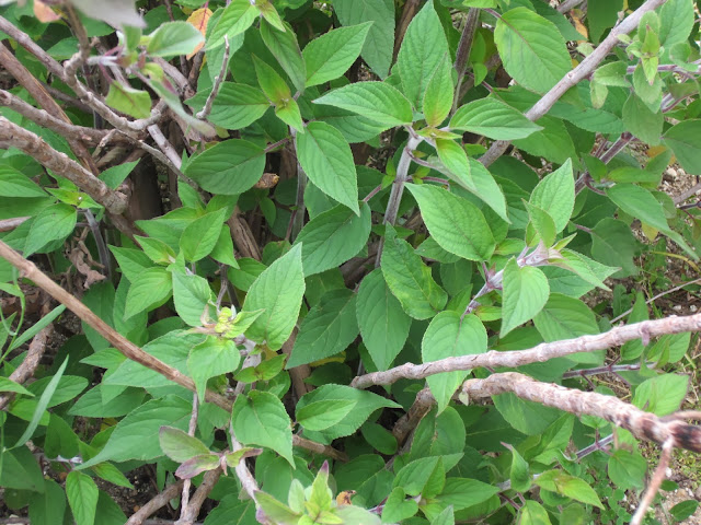 As folhas de pecíolos longos, estão colocadas aos pares ao longo dos caules. A venação destaca-se do fundo verde.  Nesta foto são visíveis folhas mais antigas em tons mais escuros. Na seguinte podem ver-se folhas novas em tons claros.